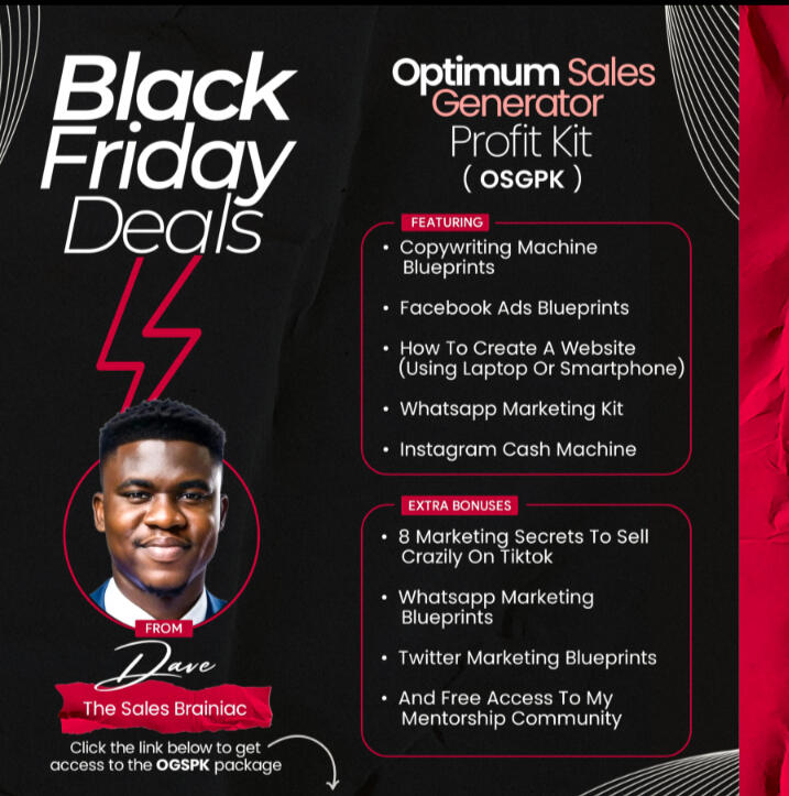 The Optimum Sales Generator Profits Kit is an online packaged tools that has been created by top experts in the world to teach you how to leverage your businesses online and skyrocket your sales ×100 of what you have been doing before.Furthermore, the OSGPK houses some highly demand profitable skill that will expose you to the little known secrets formula used by top marketers in the world to sell their products or services online and make crazy figures for themselves.